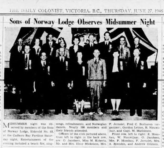 The Victoria Lodge of Sons of Norway started in 1946 when a group of local people of Norwegian heritage got together under the direction of Ella Moeskau. The Charter declares the organization date of Lodge #7-53 as May 25, 1946. There are 75 names on the charter. Records show that Ella Moeskau was the first president. The Lodge was named Eidsvold, for the city in Norway where the Constitution was signed on May 17, 1814.In 1947, a small, one-room school house on Hillside Avenue was purchased for the Norwegian community's social centre. Not everyone was in favour of the acquisition. A common comment was, “It’s too far out of town.” However, the deal was approved, and Eidsvold Lodge had a new home in Norway House. Members soon discovered that the building was too small. A kitchen was needed to prepare those delicious Norwegian treats, so the first addition was built. But to accommodate cultural and social activities, still more room was needed. A second addition was added. Now the group had enough space to meet, to dance, and to prepare food, as well as room to sit and enjoy it comfortably. The second addition was the library. By 1960, Eidsvold was again bursting at the seams. The main hall was added to the back of the little school house. The building now had the needed space to provide for a wide variety of social events. In the late 1980s, members considered demolishing the lower hall in order to create a larger, one-level hall. However, the city fathers, in their wisdom, wouldn’t grant a permit for a bigger hall within a residential area. Members had to renovate within the existing walls. The result is Norway House as you see it today.